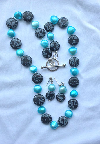 Silver, Snowflake Obsidian & Pearl Necklace & Earrings